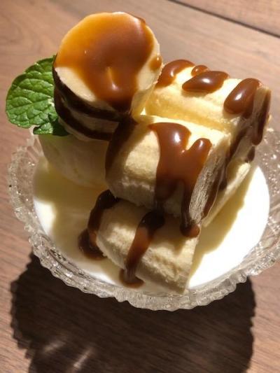 スタンダードなパンケーキには北海道らしくあんことチーズがついてきますが、小豆が苦手な私は季節もののキャラメルバナナをいただきました。ボリュームがあってお腹いっぱいになります。
