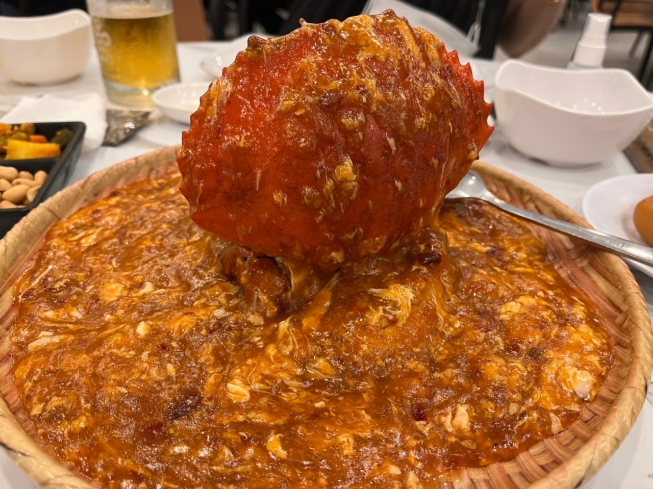 お通し的な感じでピーナッツとキムチみたいな箸休め的なもの、そしてウェットティッシュ1人1枚分がお代として取られます。追加のウェットティッシュは別料金なので、私はいつも持参するようにしています。お化粧室の洗面台は大きくて手も洗いやすいですし(ダイソンのハンドドライヤー完備)、手を思いっきりベタベタさせて蟹を満喫しましょう(笑)