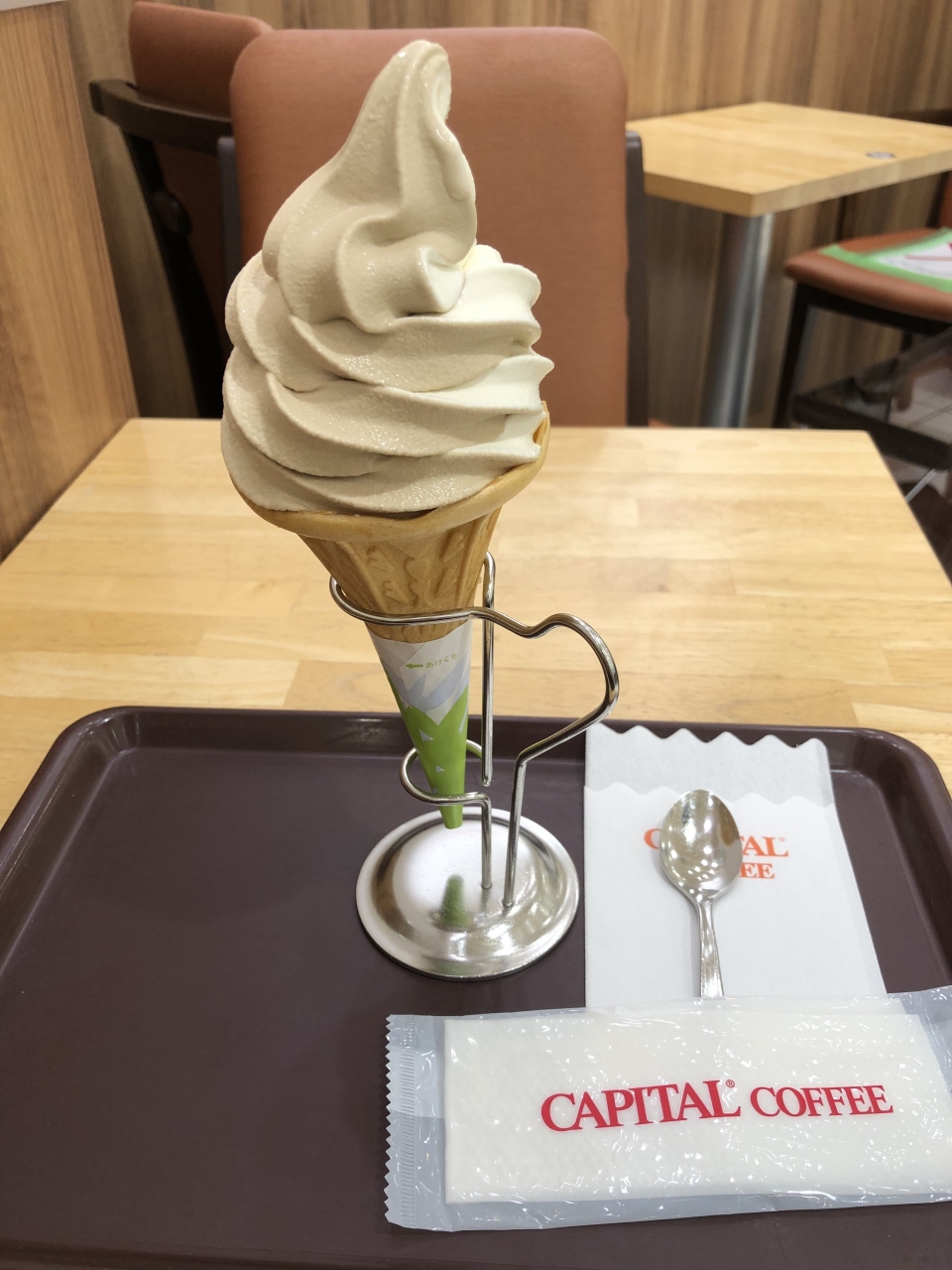 コーヒーはそんなに得意ではないのですが、ソフトクリームのコーヒー味は大好き。こちらのコーヒーソフトは見た目はうすーいベージュ色ですが、しっかりコーヒーの味と香りを感じることができます。この時はソフトクリームのオーダーだけでも店内のイートインスペースを利用することができたので、落ち着いていただくことができました。