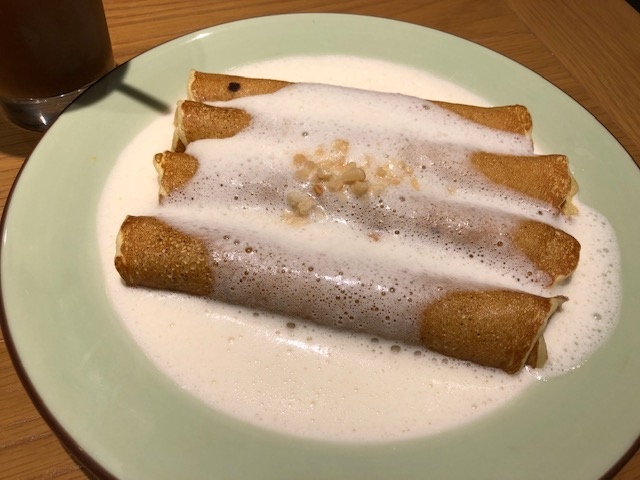 甘いマカダミアナッツクリームロールパンケーキをいただきました。名前の通りロール状になっています。余裕で食べられる!と思っていましたが、かなりボリュームがありました。ロールになっているせいか、よりモチモチ感を感じられます。店内も広くておすすめです。