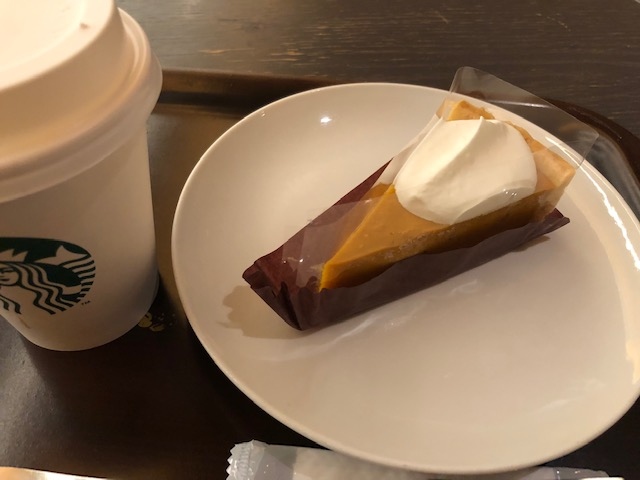 ギンザシックスの中にあるので店舗に開放感がありますが、店舗と店舗の間の通路近くの席だとちょっと落ち着かないかもしれません。スタバはケーキも美味しいものが多いですよね。この時はパンプキンパイにはまってよくいただいていました。なめらかでとても美味しいです。ギンザシックスの同じフロアにあるお化粧室も広くて使い勝手が良いですよ。