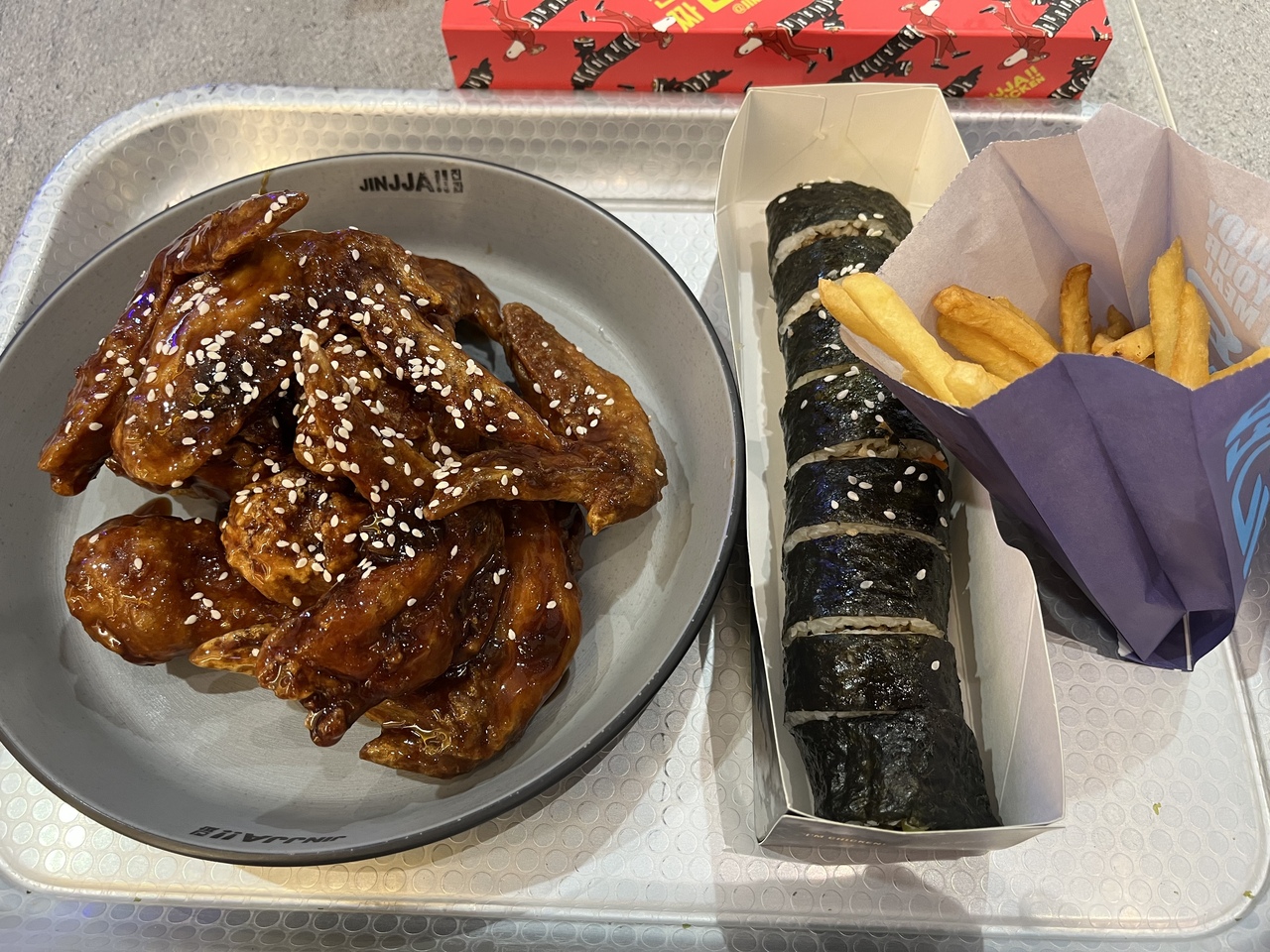 韓国系のお店も多く、今回は1階のフードコートっぽい一角で韓国のチキンやキンパを食べました!