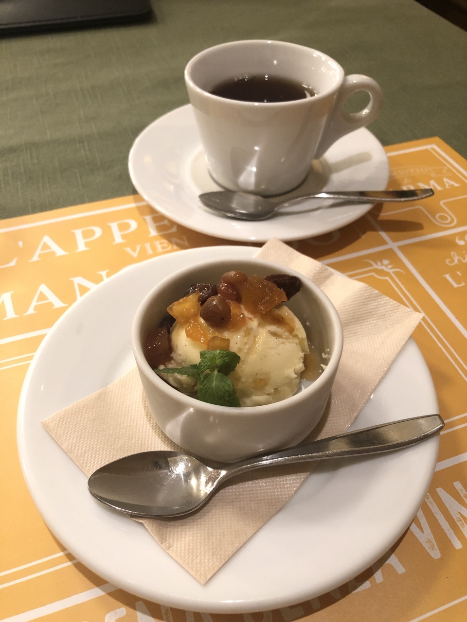 「デザートはバニラアイスか~」と正直ちょっとがっかりしたのですが、上にかかっていたドライフルーツ特にレーズンが美味しくて、最後まで幸せに完食しました。- 旅行時期