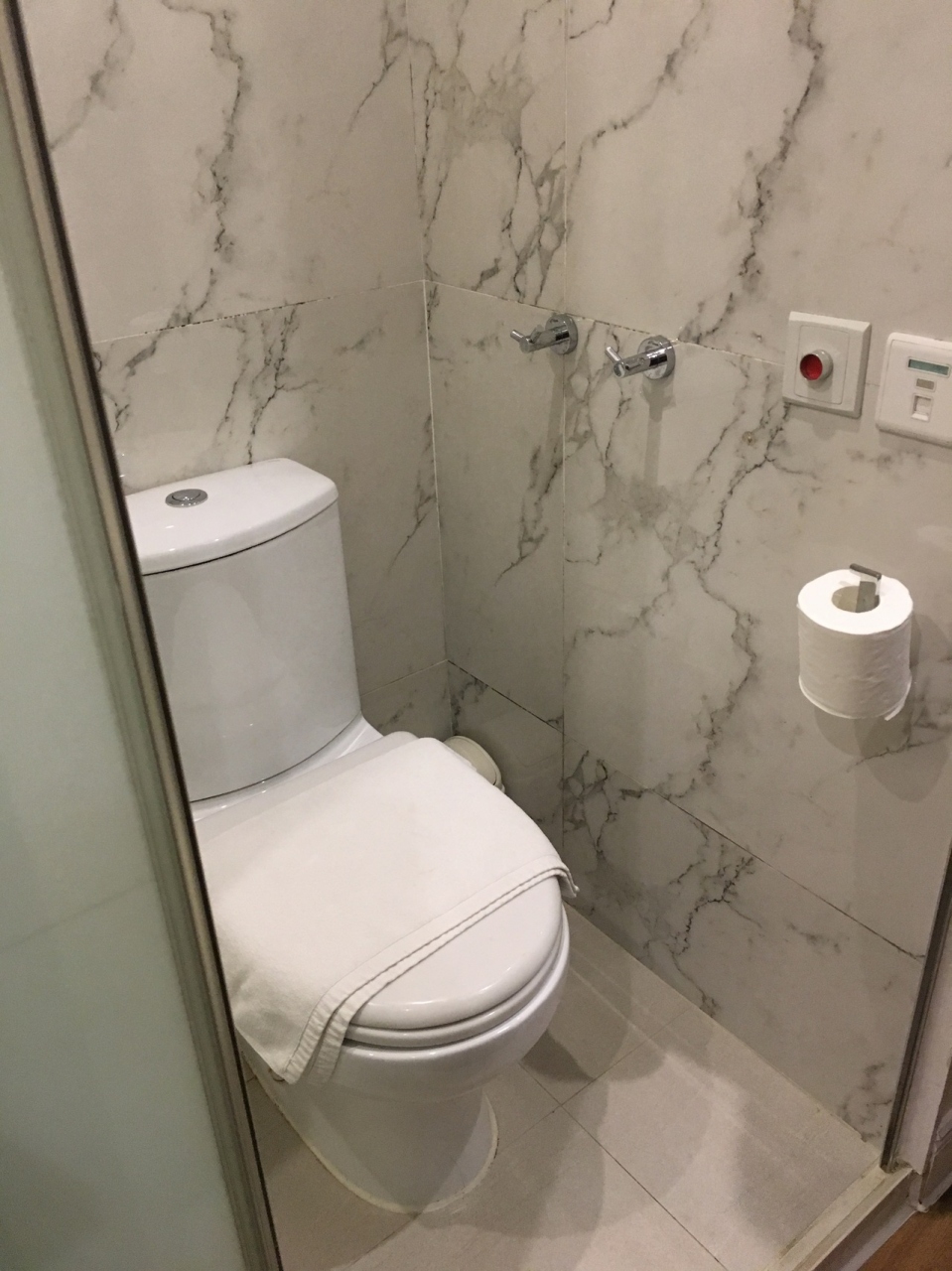 トイレと扉が近すぎて膝がぶつかるので横向きでするか扉を開けっ放しにしてするといいかと。シャワーは勢いよく出すとトイレの床までビショビショになるので注意。