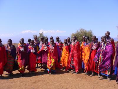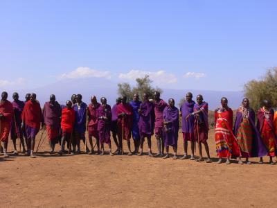マサイ族の男性陣。青や紫系の布を纏っています。写真は、歓迎の踊りと歌を...
