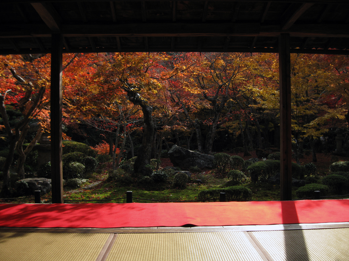 黒光りする床板に外の紅葉が写り込む「床もみじ」も有名ですが、客殿内での撮影は禁止されていましたので、その美しさをじっくりと目に焼き付けました。