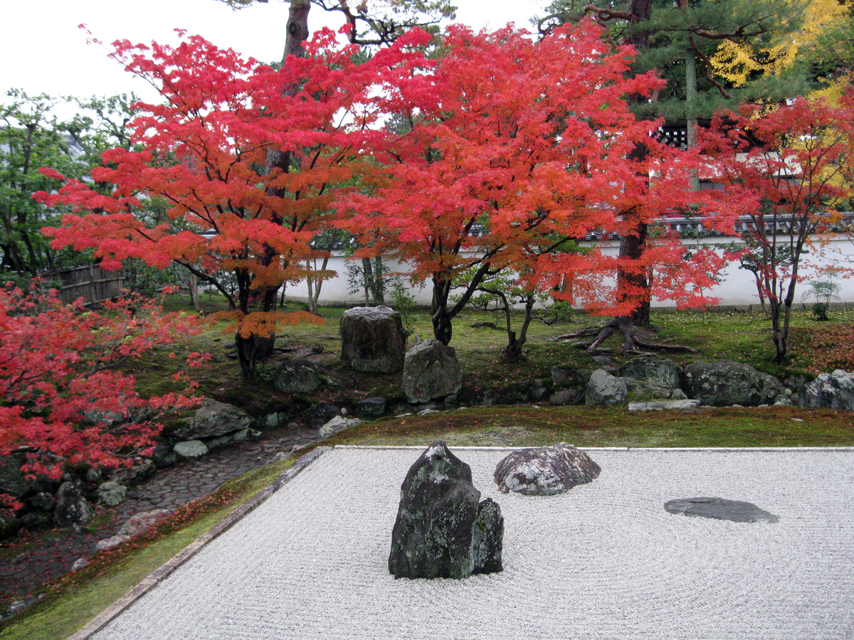 玉状に刈り込まれた緑のサツキ、庭一面を覆う白砂、庭を取り囲むモミジの赤。