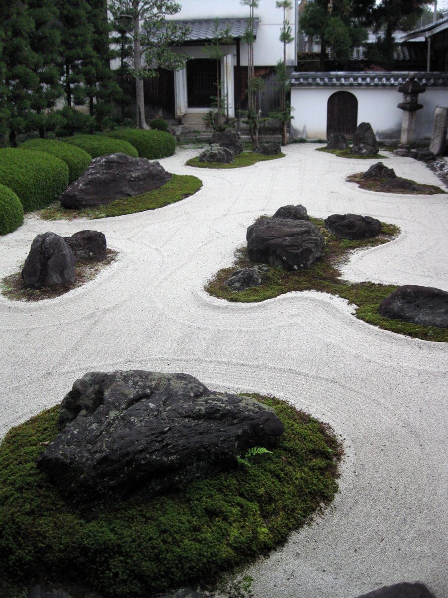 夢窓国師像を安置する開山堂の南庭は、手前が白砂に庭石を配した平枯山水、奥部が軽くなだらかな苔地築山となっていました。