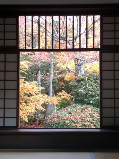 瑠璃の庭を書院二階より眺めると、窓越しに紅葉が一面に広がり眼下の庭の苔とのコントラストが見事でした。