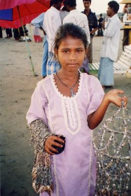 コックスバザールのビーチで貝のお土産を売る子供。これ、千葉の海岸でも売...