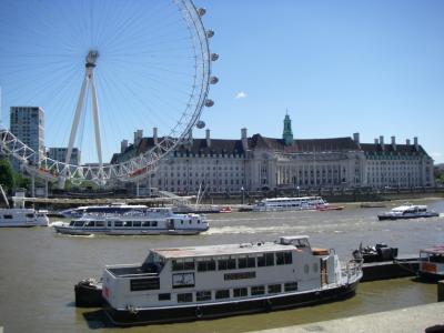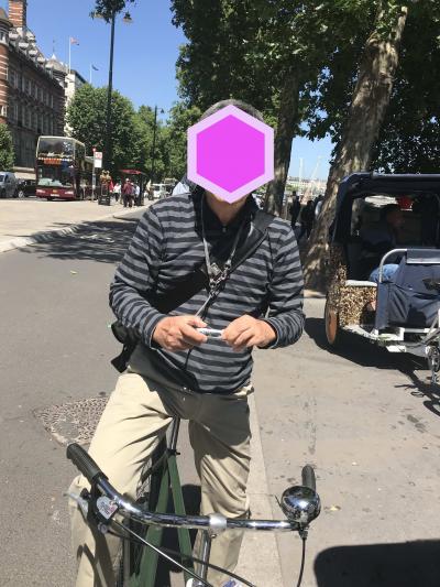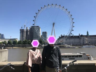 テームズ川へ出てきました。河岸に沿って遊歩道があり、車道との間に自転車...