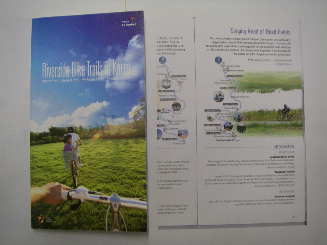 韓国のサイクリングロードのことを知っていたので、何かガイド的なものがないかと思い、館内掲示物、パンフ等を探したが、見当たらなかったので、再度カウンター内の英語担当の方に尋ねた。同僚と韓国語で話しがら、裏の倉庫らしきところで探してくれた。日本語はなく韓国語か英語なら、ということで英語版を頂戴した。しっかり製本できた新書版よりやや小さいサイズで、次回訪韓意欲がいきなり上昇した。