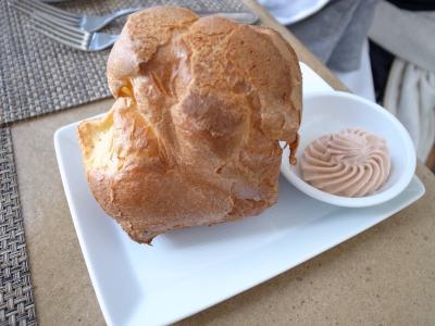 火曜日の11時過ぎに行ったら、まだほとんどお客さんもいなくて外か中かどちらの席がいいか聞かれたので迷わずテラス席に!ランチタイム限定で出てくるという巨大シュー皮のようなポップオーバーは焼き立てホカホカで、ストロベリークリームとよく合って気をつけないとメインが来る前に満腹になっちゃいそうな美味さです。マリポサバーガーはお肉がジューシーだったし、付け合わせの野菜も美味。ロメインレタスも海老もとても美味しかったです。アイスティーもお水も、少なくなったら継ぎ足してもらえます。サービスも適度な距離感とフレンドリーさで、買い物の途中におしゃべりしながら景色をみて料理を楽しむという最高の時間を過ごすのに、このお店はベストの選択だったと思います。