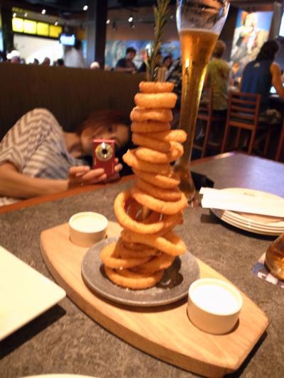 ビアタンクに繋がれたパイプが通っており、カウンターの中にあるそれぞれの銘柄のビールサーバーから注がれる仕組みのようです。ハッピーアワー金額の料理は種類も豊富で味もよく、130種類くらいあるというビールも半額です。店員さんおすすめのロコビールとオニオンリングタワー、カリフォルニアロール、マグロのカルパッチョ、フィッシュ&チップス、枝豆などを注文し、料理は4人でシェア(ビールはハーフヤードグラスを一人ひとつ・・・)して、大満足のディナータイムを過ごし、一人20ドルくらいでした。ハッピーアワーばんざい!!おすすめは、カリカリのオニオンリングタワーと、フィッシュ&チップスかな。外人さんで満席で、みな楽しそうに過ごしていて店員さんもよく気が付いて優しかったですよ。- 旅行時期