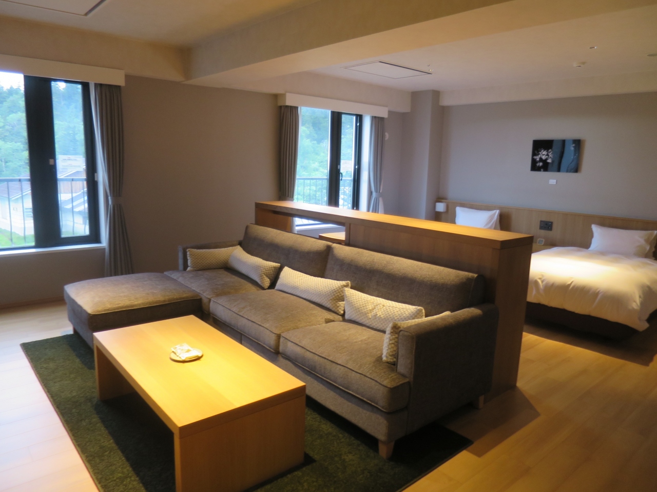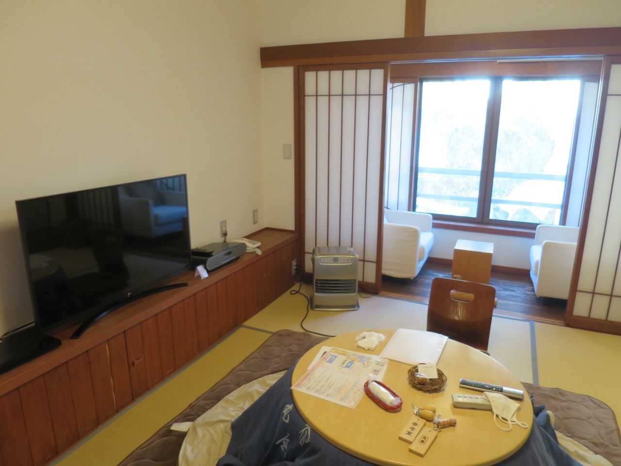 ゆったりとしたリビングスペース、旭川家具、ネトフリもみられるテレビ、館内着とパジャマもそろっていて、のんびりくつろぐことができました。