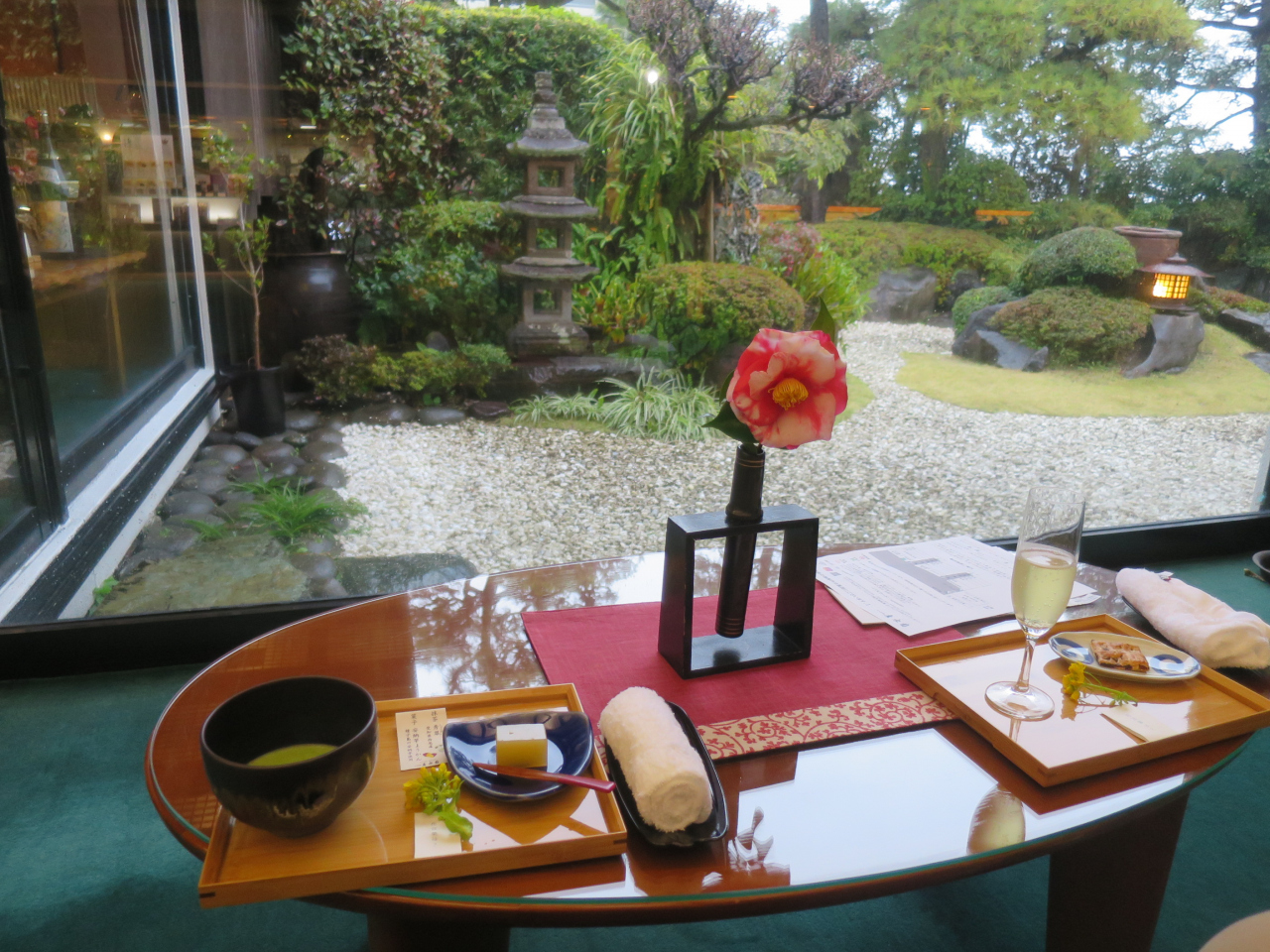 ウエルカムドリンクは抹茶かスパークリングワインを選べ、庭園を眺めながらゆったり。