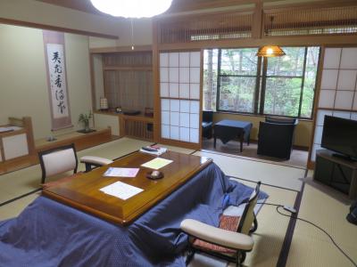 本館1階かけ流し温泉付 和室12.5+6帖 1泊2食付き スタンダードプランひとり38,500円也。