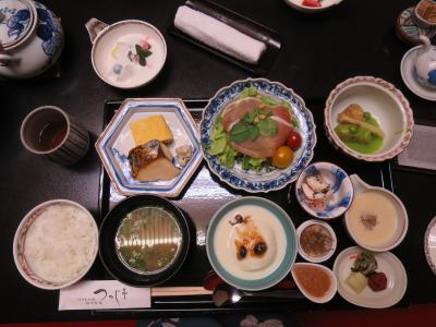 露天風呂や寝湯、丸太風呂を楽しんでから、夕食は別館のお食事処で。