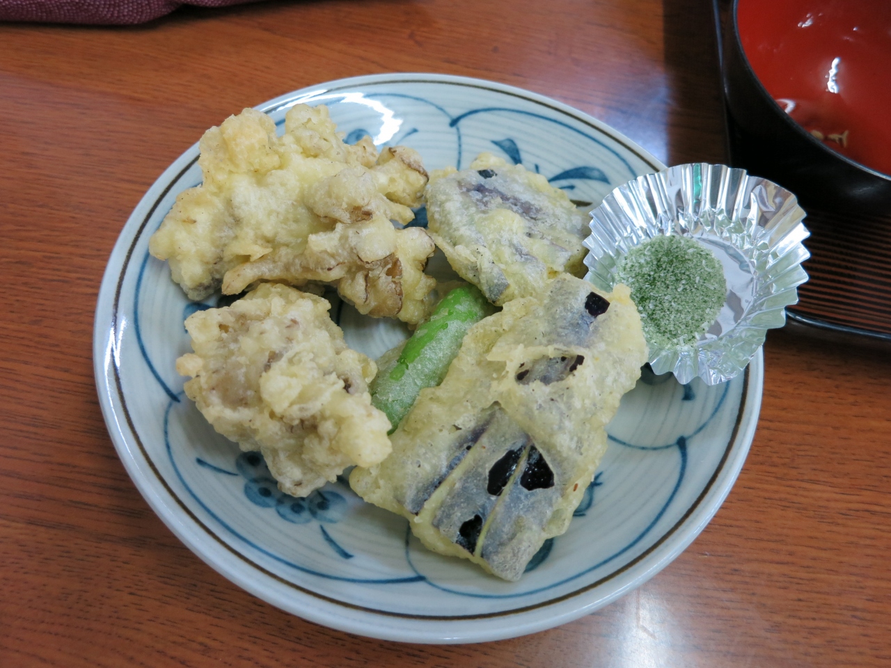 山菜や揚げたての天ぷら、おそば、温泉卵など