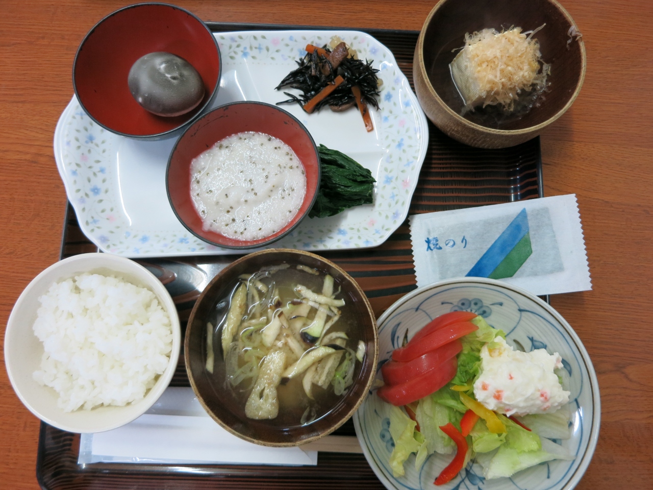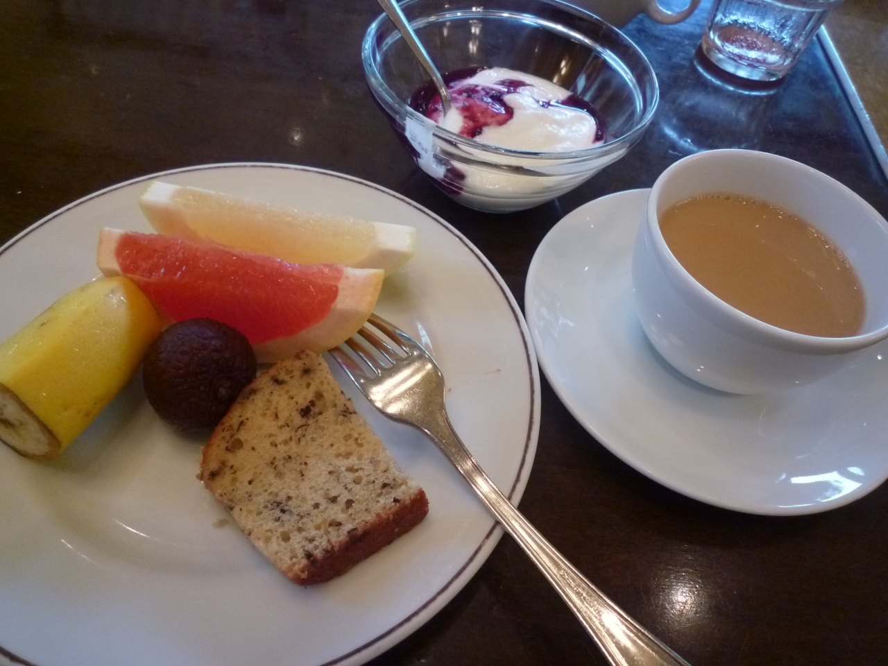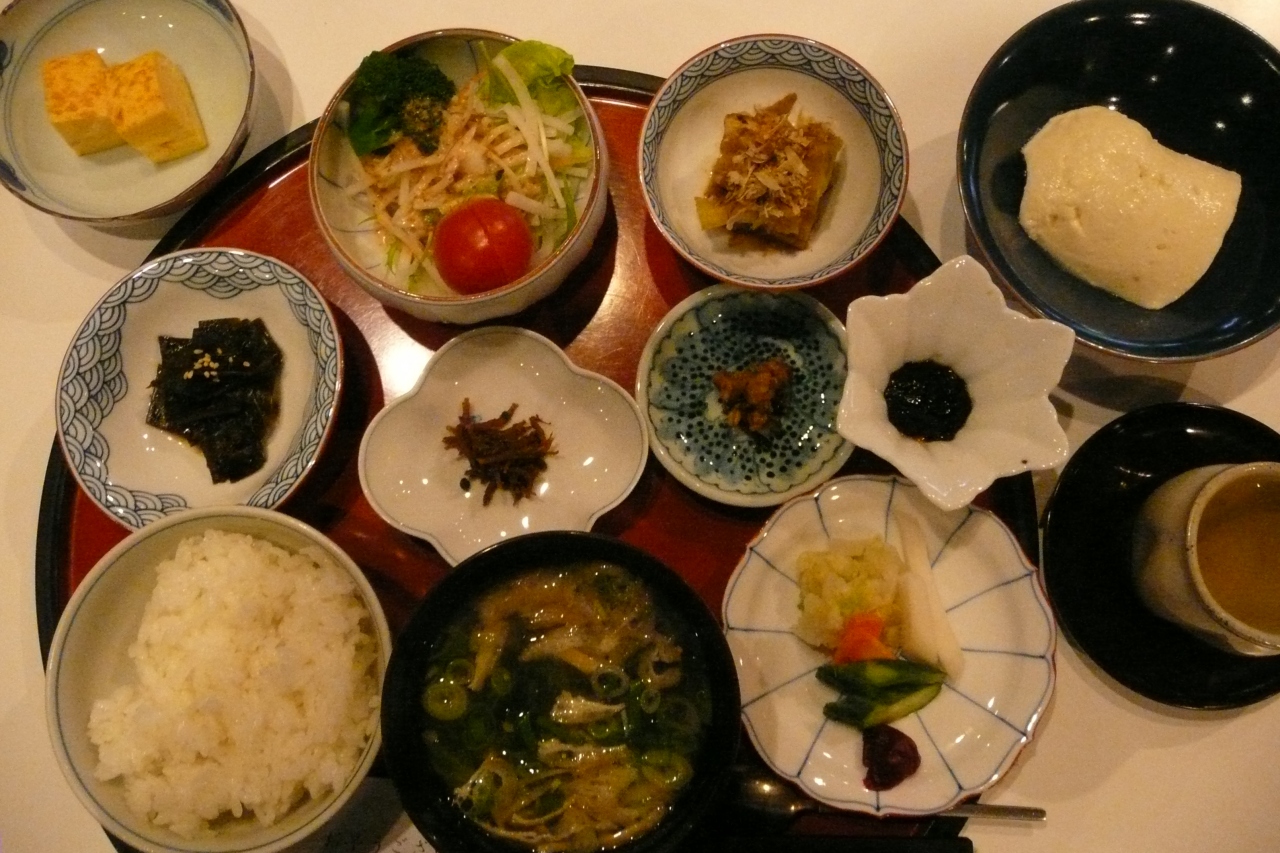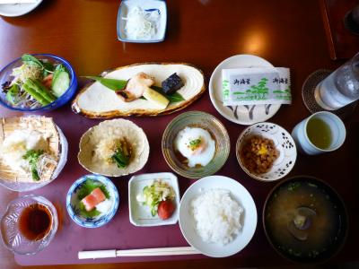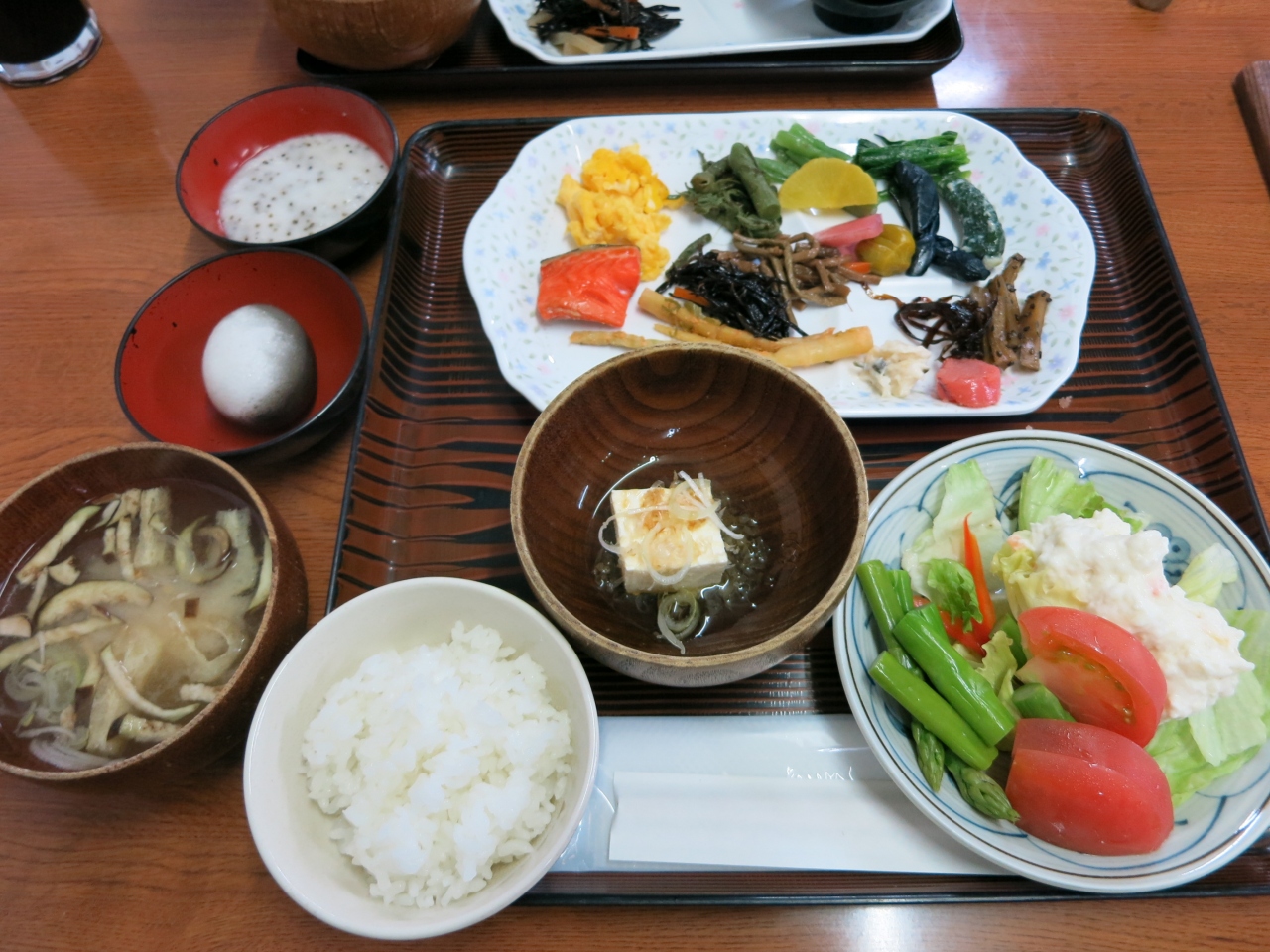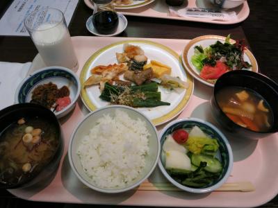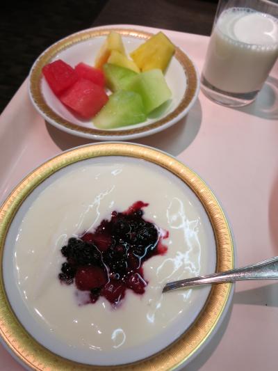 眺めの良い窓際の席に案内されると、まずレモンミルクを1杯。ビュッフェコーナーには、野菜や果物、黒豆豆腐、ヨーグルト、ジュース、牛乳、コーヒーなどが並んでいるので自由にいただきながら定食がくるのを待ちます。ご飯か海苔のおかゆを選べるので、あたくしはおかゆにしました。ゆっくり時間をかけてたっぷりの朝食をいただいたので、お昼になってもお腹がすきませんでした(^^;
