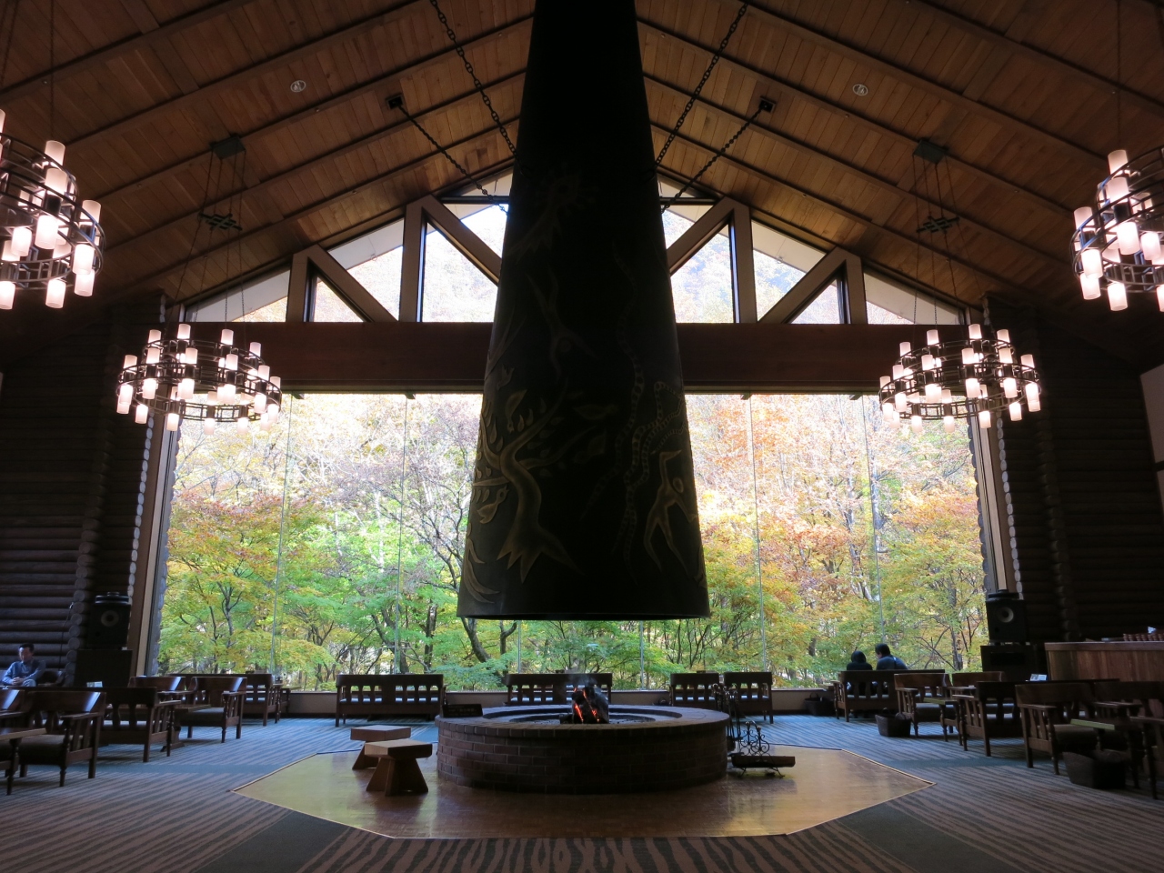 星野リゾート奥入瀬渓流ホテルといえば、岡本太郎作の巨大な暖炉があるこちらのラウンジ!