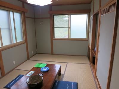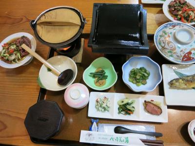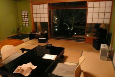 水上温泉の7室しかない小さなお宿。予約したのは、10畳和室「かたくり」の「期間限定!特典付き平日プラン」で、料金は1人17,475円(2名1室)です(特典は、夕食時ワンドリンクサービスと記念写真)。このお部屋は露天風呂もついていない一番安価なプランだったのですが、館内には露天風呂(残念ながら温泉ではありません)と内湯(アルカリ性単純泉)が2つずつあり、無料で貸切利用できるので、このお部屋でも充分満足できました。