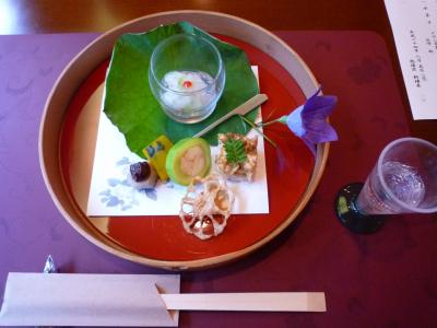 ・お山の先付け(はやと瓜の胡麻和え、牡丹肉のトマト煮、自家製胡麻豆腐、季節の天ぷら)