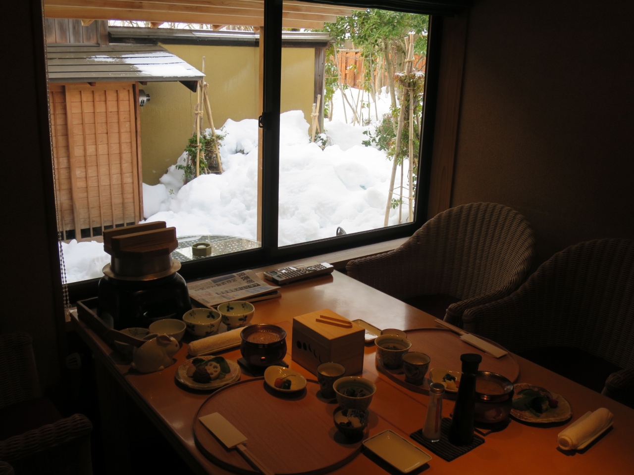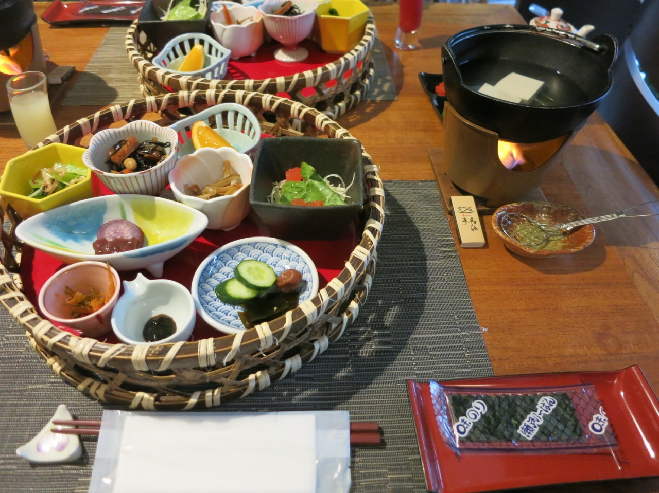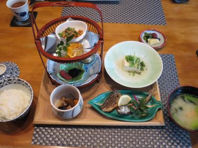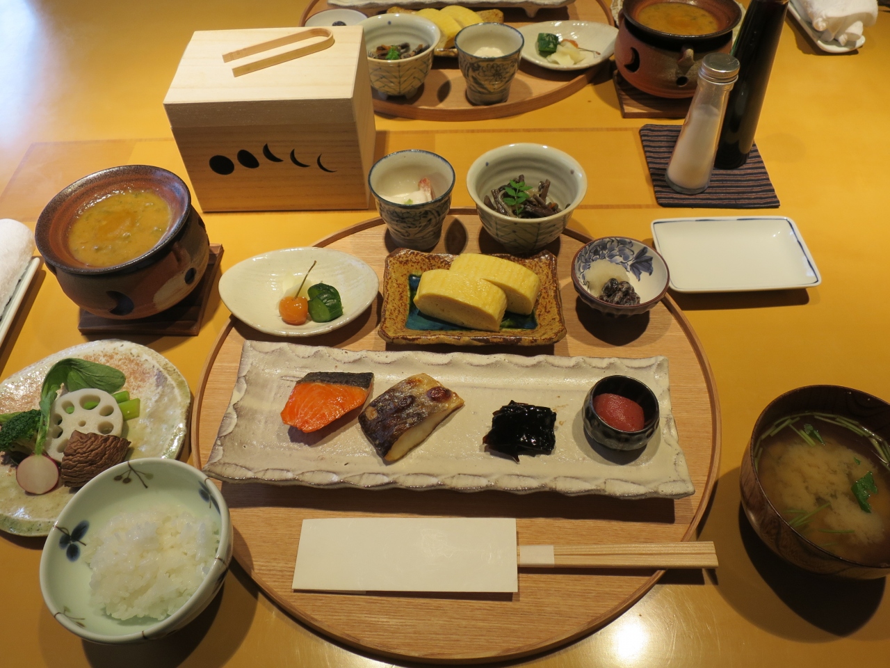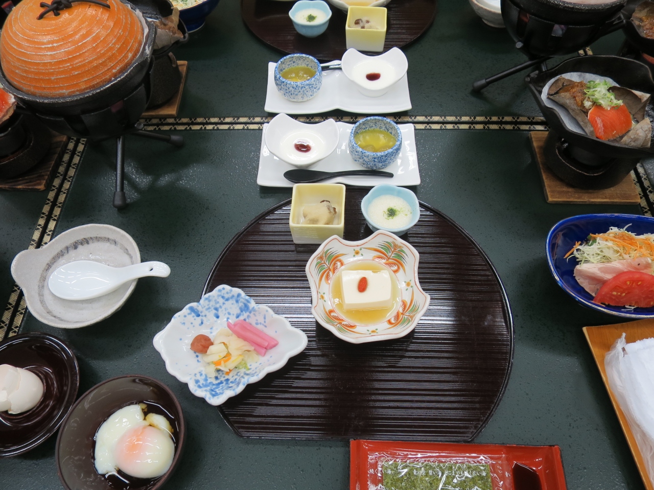 朝食も、籠盛りのおかずのほか、湯豆腐、卵焼き、焼き魚と充実した内容。