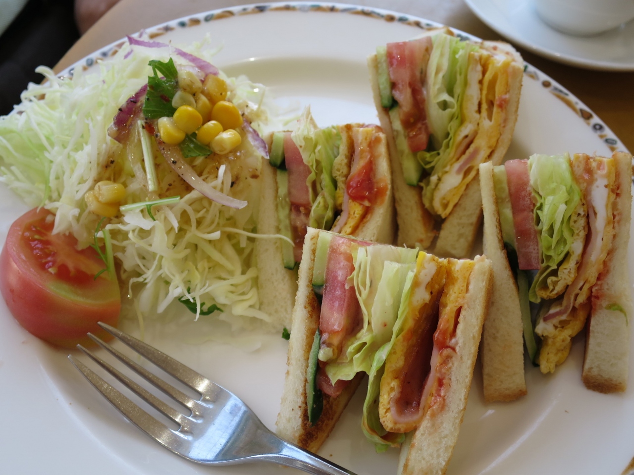 クラブハウスサンドは、パン2枚の間にベーコンエッグ、レタス、トマト、きゅうり。
