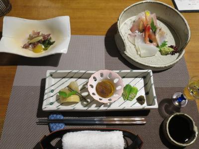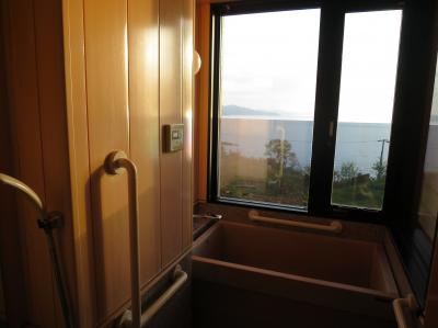 お部屋の展望檜風呂から日本海に沈む夕陽を眺めてから、レストランで夕食。