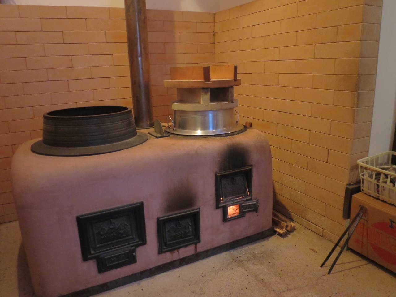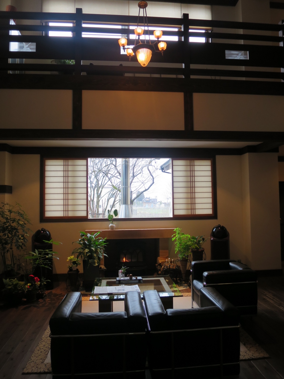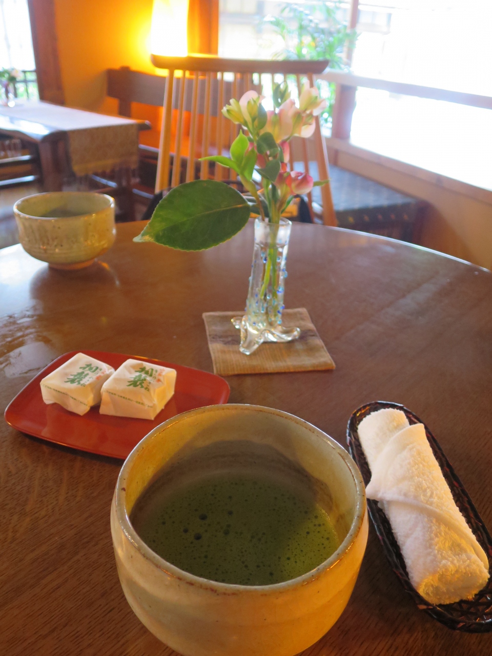かまどのある土間で靴を脱ぎ、薪ストーブのあるロビーでお抹茶をいただきます。