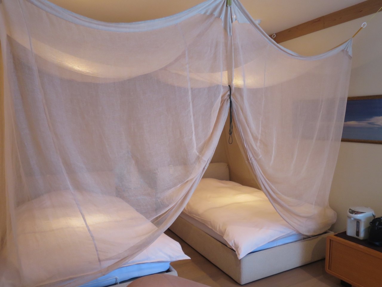 ツインは、広さ21平米で120×195cmのベッド2台