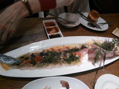 生牡蠣の食べ放題&飲み放題のお店ですが、生牡蠣が苦手なので普通に海鮮を頂きました、シーザーサラダにバーニャカウダー、アヒージョ、カルパッチョ、ステーキ、最後に牡蠣のリゾットを頂きました。どれも美味しく新鮮でした。写真はカルパッチョ(沖縄の地元の魚です名前は失念しました)でこの後魚の頭と骨でスープにして美味しく頂きました。皿が大きいですが内容がやや小ぶりに感じますがどれも美味しくサービスもよかったです。