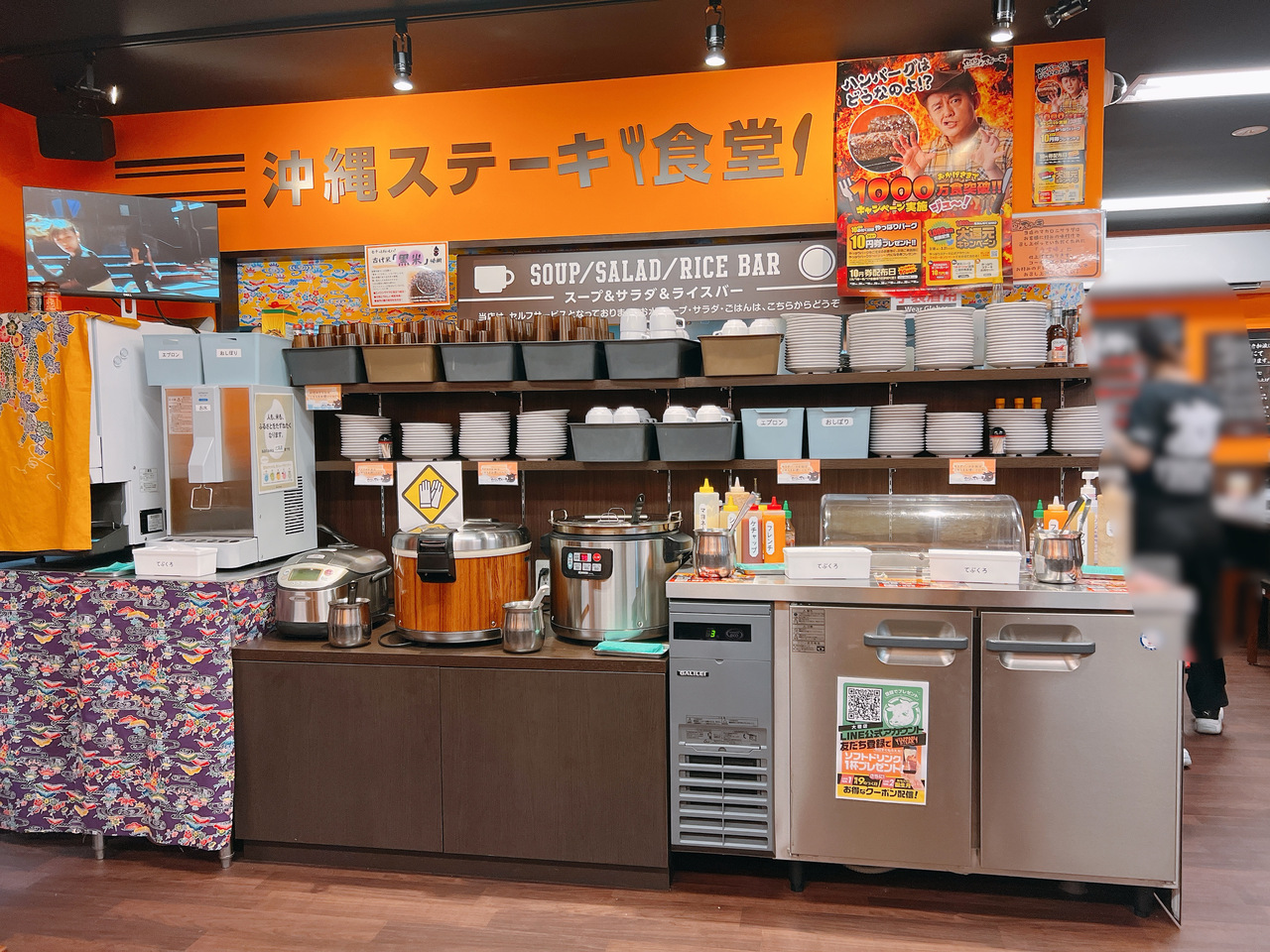 肉の焼き上がる間にサラダ(カットキャベツとマカロニサラダ?)、スープ、ご飯(白米・黒米)のバイキングを食べました。ステーキ代に含まれている食べ放題なのでお得です。
