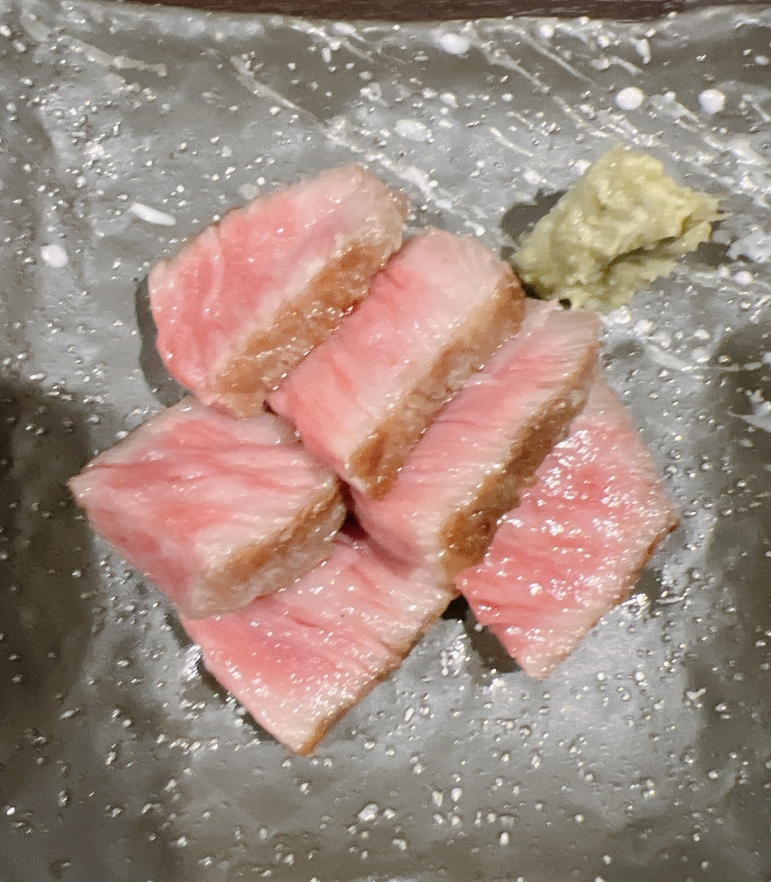 18:30にると前菜から始まり、ウインナーにポークと続いて赤身が出ます。どれもとても美味しくて塩やテーブルにある薬味をつけながらで十分美味しいです。