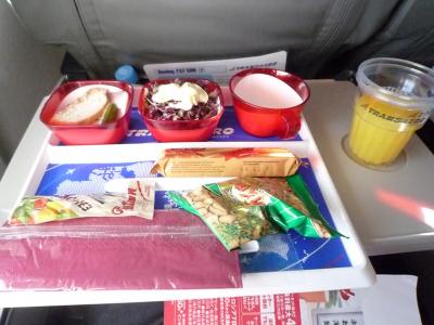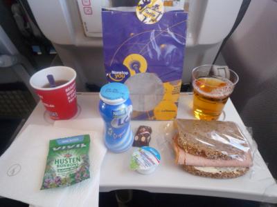 定刻より少し遅れてのフライトでしたが、機内食は袋に詰め込まれており、軽食のサンドイッチ、ヨーグルト、チョコ等、オシャレでした。- 旅行時期
