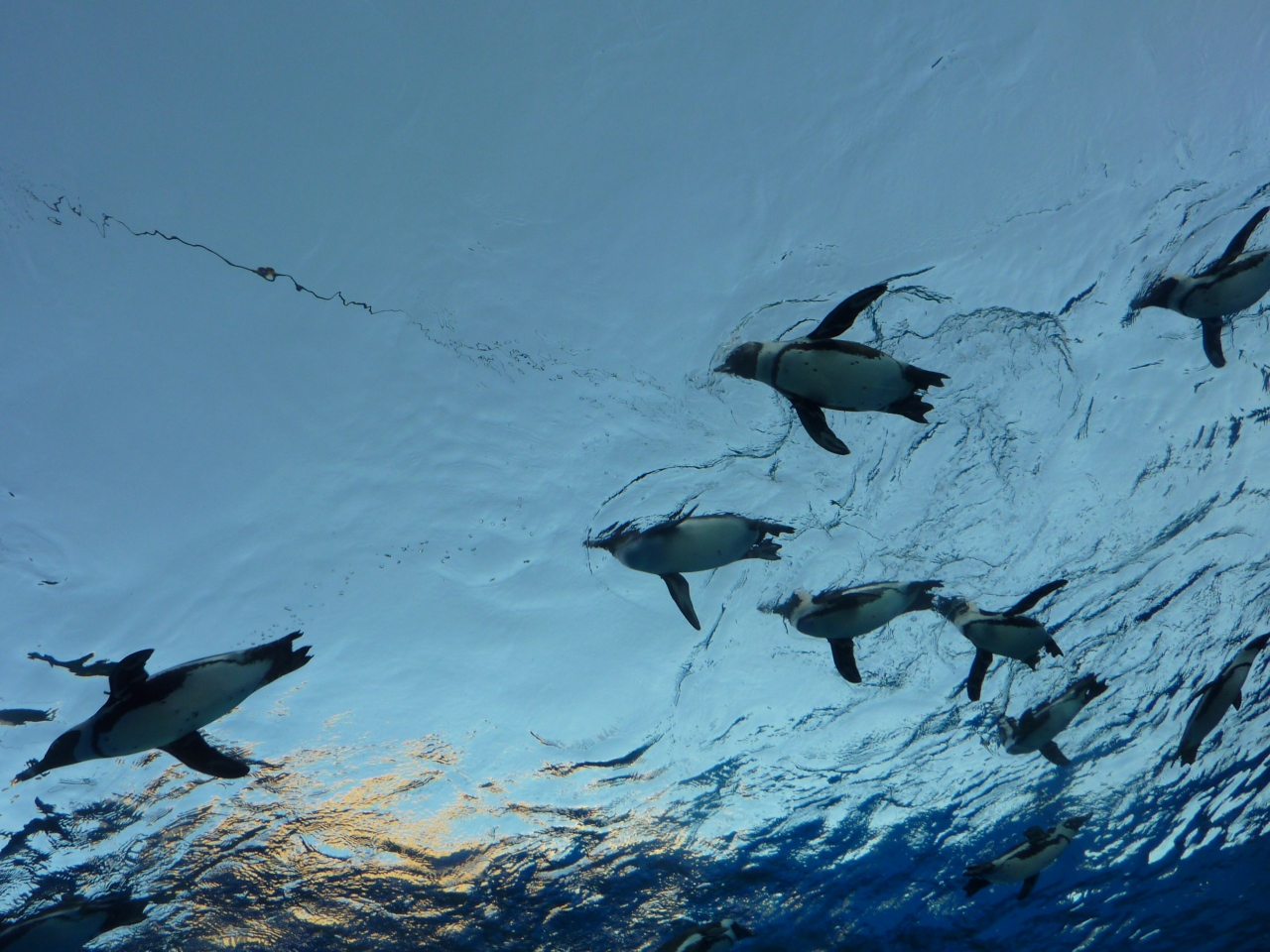 都心でペンギンを見ることは他所でも可能ですが、飛行(泳ぎ)や愛らしいよちよち歩きを間近で存分に堪能することができます。晴天時の飛行は特にお勧めです。また、ペンギン達の食事タイムは壮観です。通常時は、1、2羽が飛び回っている程度ですが、食事タイムの際には一斉に魚の争奪戦が始まります。