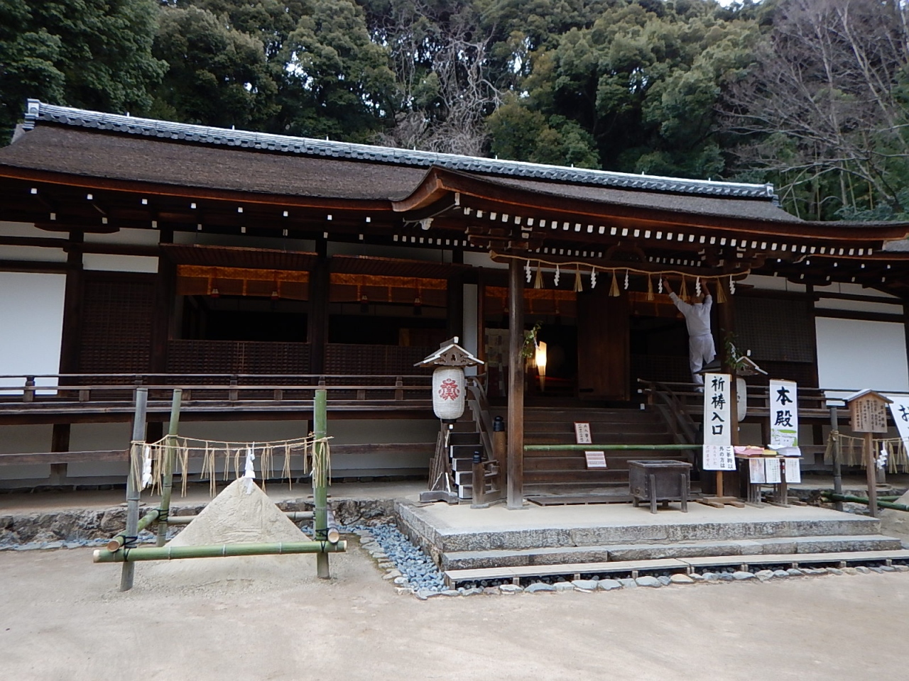 階段を上って境内から宇治上神社へと抜けていける。宇治上神社は世界文化遺産。思ったほど広くはないが、拝殿と本殿は檜皮葺で、歴史を感じさせる。本殿と思っていた建物は覆殿で、中を覗いてみると小さな本殿が収められていた。- 旅行時期