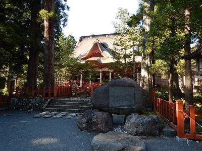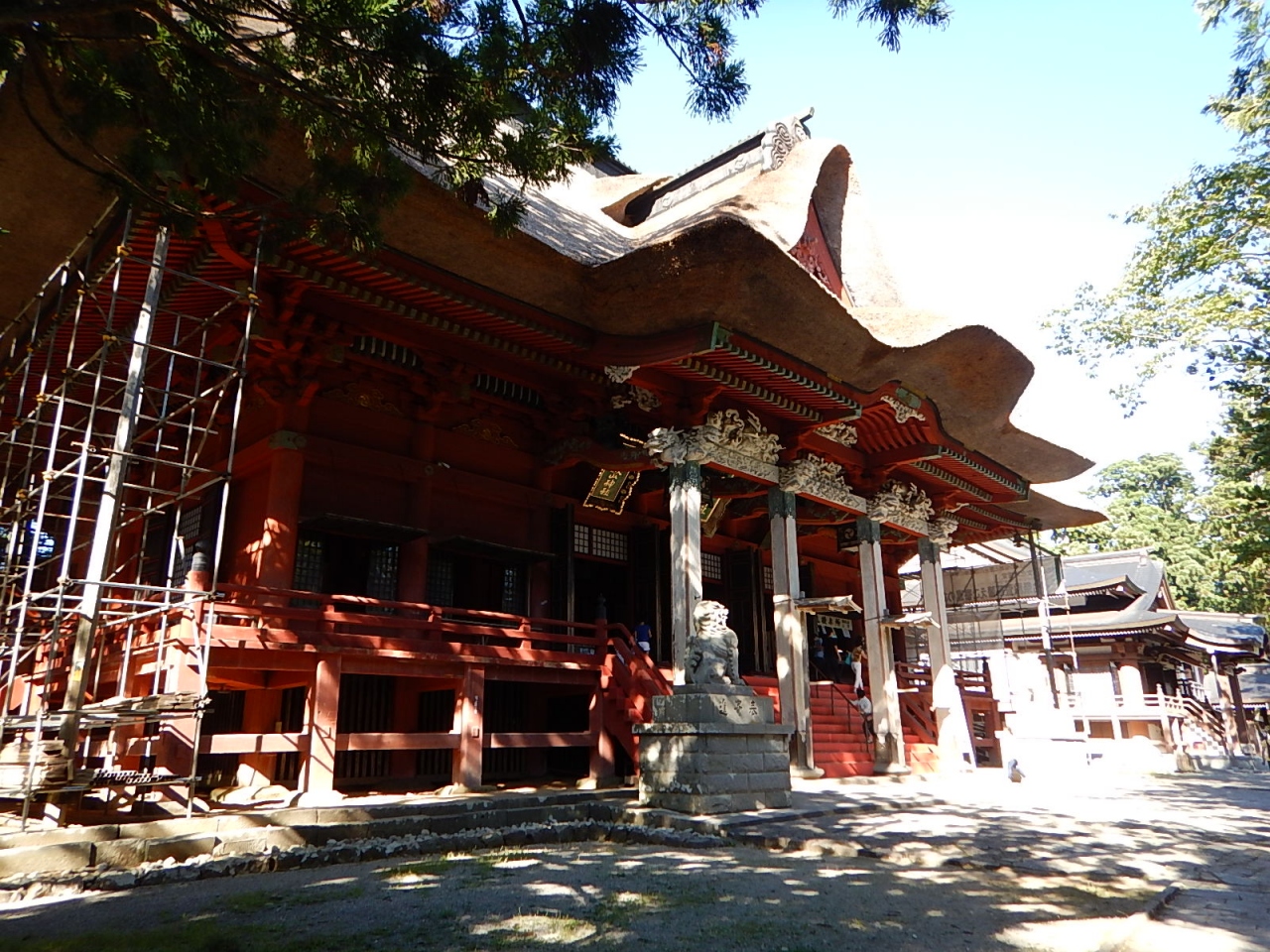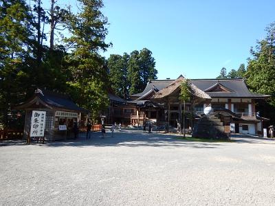 三神合祭殿は桧皮葺で荘厳な造りである。上りきった御利益を受けていると風がとても気持ちいい。