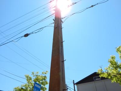 四角い電柱にあまりなじみがないが、近くには新しいコンクリート電柱があり、比べるて見ると色が違うので古いように見える。