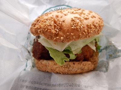 一番人気のチャイニーズチキンバーガーを注文。注文を受けてから作るため席で少し待つ。届いたバーガーはチキンが熱々でボリュームがかなりある。ゴマが落ちやすいので注意して食す。