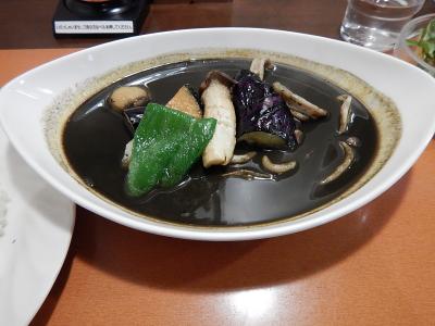 ブラックの熱々スープカレーに素揚げされたなすやじゃがいも、かぼちゃなどの野菜とイカの輪切りがゴロゴロ。決して辛すぎず、ご飯との相性も良い。- 旅行時期