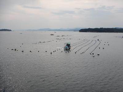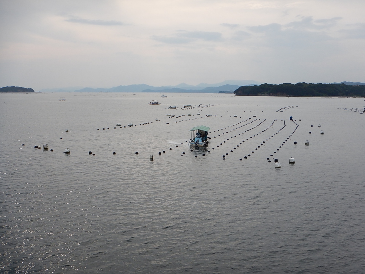 英虞湾といえば真珠の養殖が有名で、船上からブイやイカダがたくさん見られる。