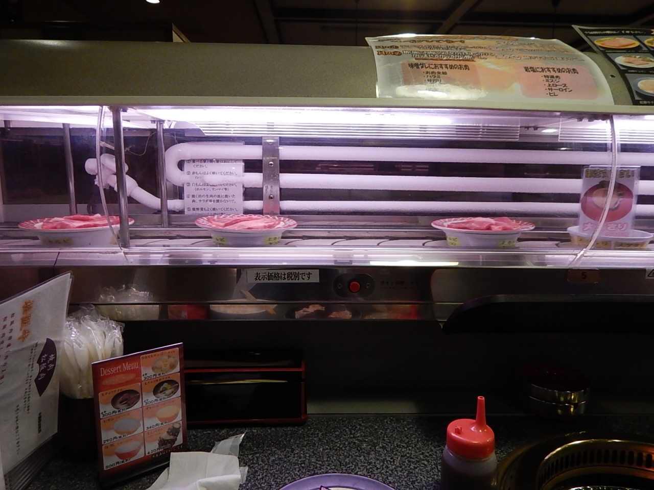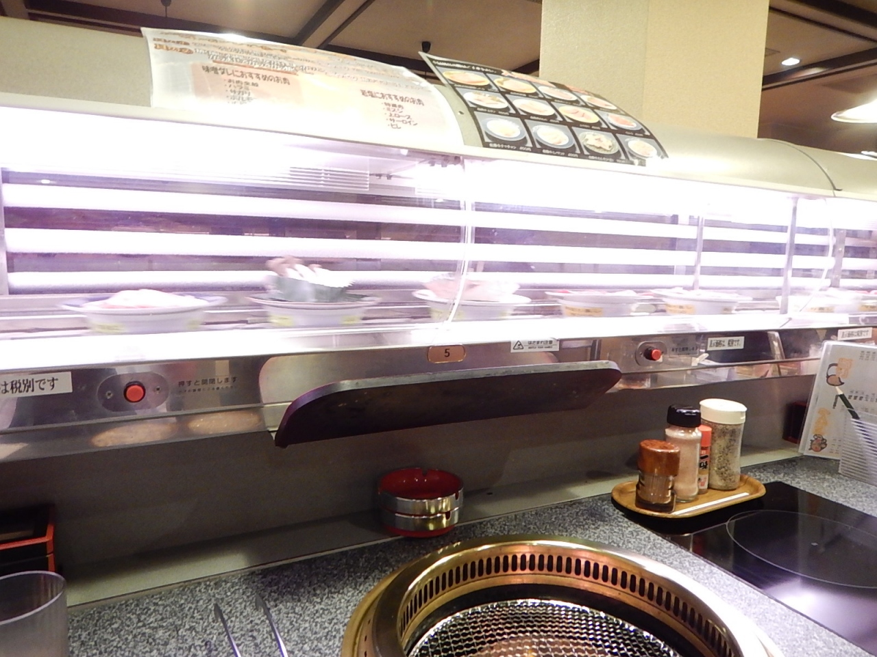店内はファミリー向けテーブル席とカウンター席に分かれており、カウンター席が回転焼肉になっている。つまり回転寿司のようにお肉がレーンを回り、好きなものを取って焼くというシステム。個別に注文もできるので、松阪牛のカルビがたくさん食べたい!という人もカウンターでも大丈夫。やはり松坂牛は細かくサシの入っていて他の肉とは全く舌触りが違う。