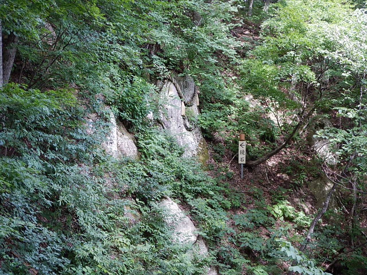 境内から離れた場所から山へ入っていくと、たつこが鏡の代わりに姿を映したとされる、鏡石がある道へと入っていく。結構な坂と階段を登って行った先にある見晴らし台から鏡石を見ることができるが、どのように感じるかは人それぞれ。