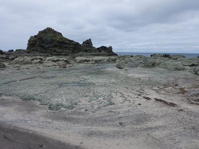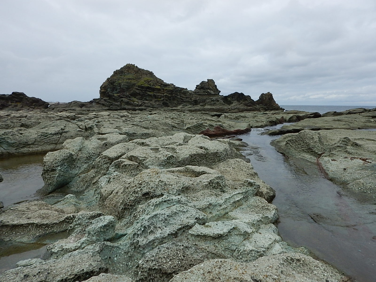 やや緑がかった凝灰岩の岩が広がっており、絶景というよりも奇景と呼ぶべき風景である。