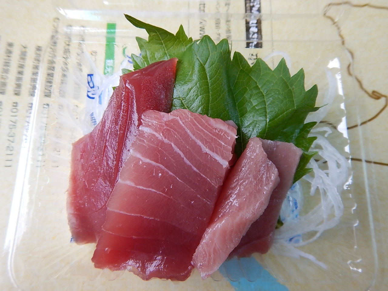 パックに入ったマグロの刺身は、赤味・中トロ・大トロ各1切れで1パック1000円。
