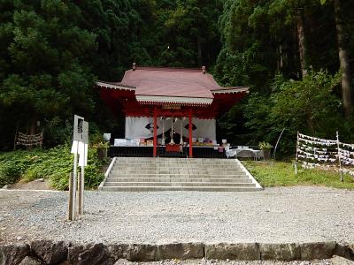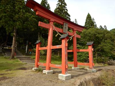 御座石神社は竜に姿を変えたたつこを祭る神社で、湖の端に建てられた朱塗りの鳥居が特徴。