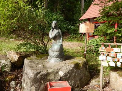 境内には龍に姿を変えたとされるたつこ像が奉られており、湖畔の黄金のたつこ像とは全く違った姿を見せている。