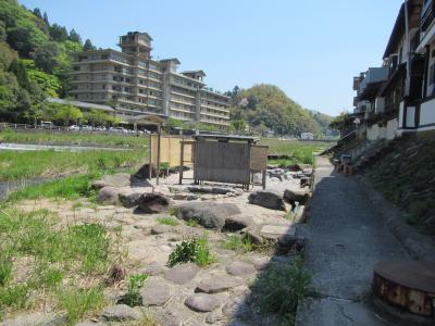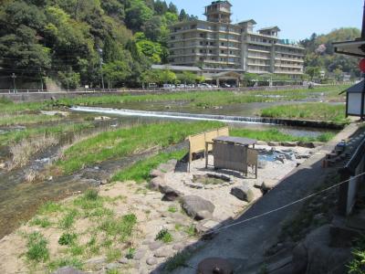 階段を下りて河原へ入るとまず小さい足湯がある。